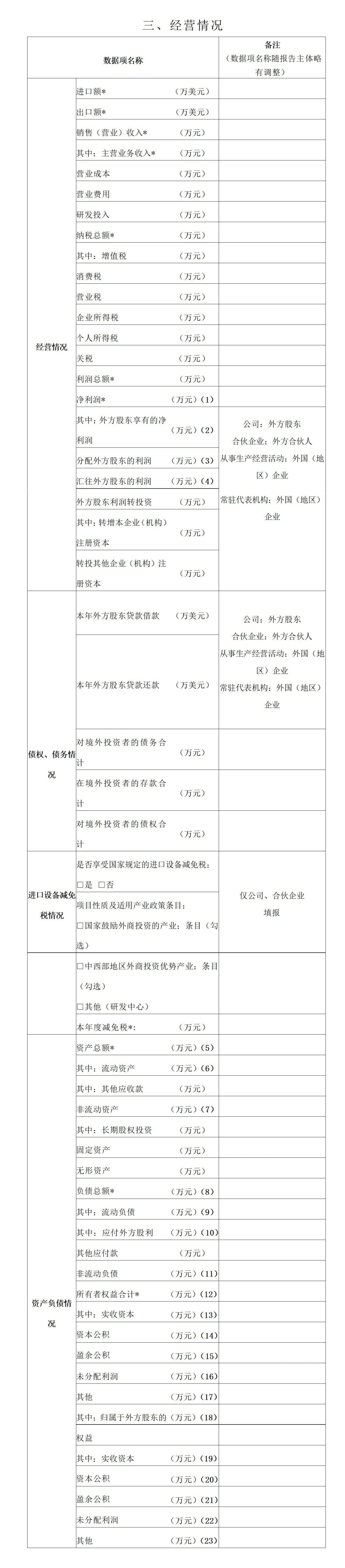 “多报合一”中FDI存量权益数据集中在国家企业信用信息公示系统-表《三、经营情况》(详见附表1,涉及“经营情况”和“资产负债情况”两个模块)和表《四、外商投资的投资性公司子公司情况(子公司合并填报)》(详见附表2),共计29个相关项。