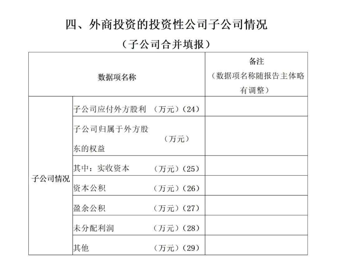 (三)表《四、外商投资的投资性公司子公司情况(子公司合并填报)》中涉及的数据项